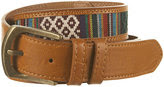 Multi coloured, patterned woven belt with tan leather look trim. 89% Polyurethane,11% Cotton